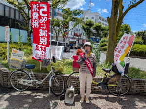 豊北ゆう子議員は、7月20日に行われた参議院選挙で、自公を過半数割れに追い込み、消費税引き下げ実現の可能性が大きく広がったこと、また選挙区候補の清水ただし候補を国会に戻すことが出来なかったことなど、参議院選挙結果報告と物価高騰対策として消費税一律5%減税など選挙中に掲げた公約実現にがんばる等訴えました。