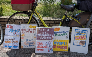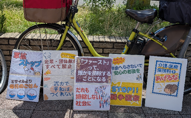 女性宣伝に参加したOさん等4人は、ビラや手作りのミニプラスター「介護・医療保険料をあげるな」「年金へらさないで・安心の老後を」「誰も排除しない社会に」「企業団体献金すべて禁止」「軍拡ストップ・ミサイルより毎日のごはん」で