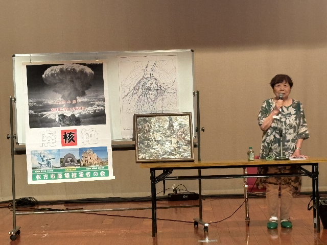 枚方市在住の原爆被害者の会」会長の森容香さんが、「原爆投下、姉に手を引かれて逃げた5歳の私」と題して講演しました。