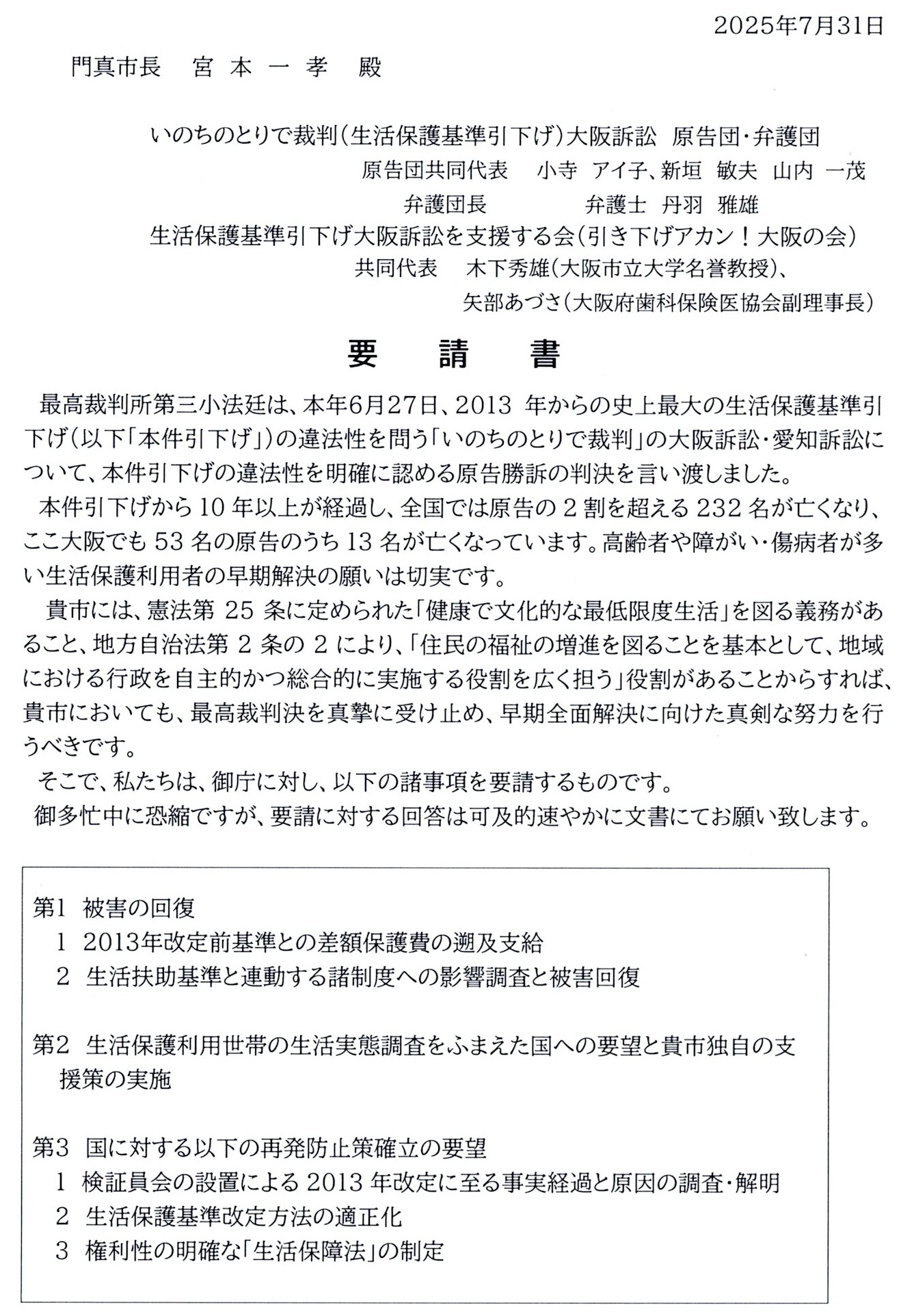 要請書は、国が保護基準引き下げ後10年以上が経過し、原告の2割を超える232名が亡くなり、大阪でも53名の原告のうち13名が亡くなっており、高齢者や障がい者、傷病者が多い生活保護利用者の早期解決の願いは切実で、3点について求めています。