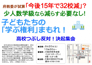 そして「会」は、9月20日(土)13時30分から大阪府教育会館(たかつガーデン)で「高校つぶし反対!決起集会」を開くことにしています。