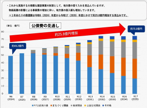 「財政収支の見通し」では、令和6年度と令和5年度の歳入歳出について比較し、歳入歳出の推移や特徴について紹介したうえで、中期的(令和17年度まで)な財政見通しを示し、このまま推移すれば、「現在予定している事業などの要因により、令和8(2026)年度以降、実質収支の不足(赤字)が生じることから、財政調整基金の取崩しが必要」だとし、「令和11(2029)年度以降は、(財政調整基金を取り崩した場合でも)実質収支の不足(赤字)が生じる見込み」であることから、「8年度の当初予算で一般財源ベース6億円を削減する」 とし、それでも厳しい財政状況であれば、「行財政改革への移行」 を行うとしています。