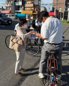 6日、市民や元教員等16人が参加し、門真西高校に近い通りで「子どもたちの学ぶ権利を保障するため、門真西高校の存続を」「廃校でなく30人学級を」と、地域の人や市民にチラシを配りながら呼びかけました。議員団から豊北議員も参加しました。 守口市在住の女性が「子どもが西高校に行ってました。西高がなくなるんですか。困りますね。頑張ってください」と署名し、学校帰りの高校生も、「弟も西高校に入りたいと言っています。無くなると困ります」「僕らも署名していいんですか」と、自転車を止め署名に応じてくれました。参加者らは、「まだまだ知らない人もたくさんいる。もっと知らせていかなくては」と語っていました。 「門真西高校を守る会」は、多くの市民と一緒に地域の学校を守るため、10月26日(日)14時~16時「門真西高校廃校アカン集会」をルミエールホール研修室で行う予定です。