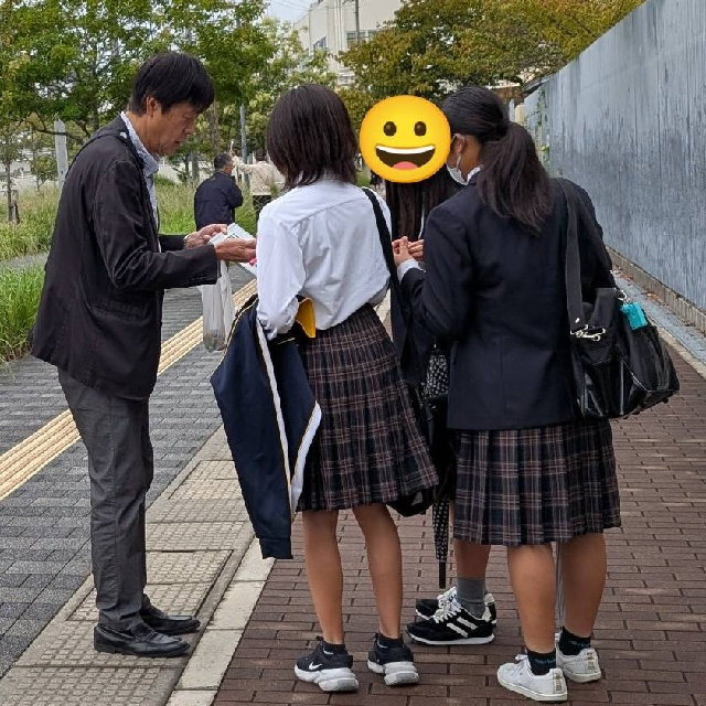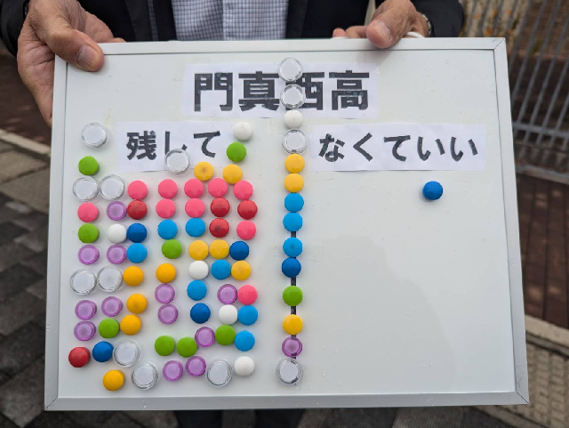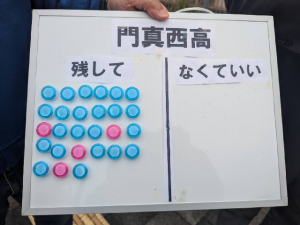「門真西校を守る会」は22日、市内中学校で門真西高校についてアンケート。112人が回答し、「残して」が97人で87%、「なくていい」1人、「わからない」が14人で朝の登校時にもかかわらず、対話が弾みました。アンケートは豊北ゆう子議員も参加しました。