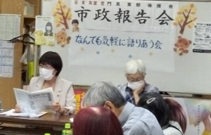 日本共産党門真東部後援会は10月19日市政報告会を開き、9月議会で出された議案等について豊北ゆう子議員が報告しました。