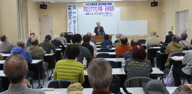 講演では、大阪平和委員会会長で弁護士の西晃氏が、2015年の安保法制定以降の沖縄・南西諸島・西日本における軍事化の流れ、これまで戦争はどうやって作られてきたのか、再び戦争の惨禍を起こさせないため私たちにできることは何か?について詳しい報告や問題提起がありました。