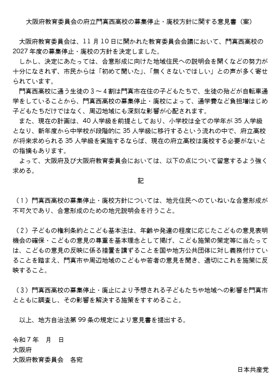 また、門真西高校を2027年に募集停止・廃止する方針が8月に大阪府教育委員会会議において決定したことから、「門真西高校を守る会」から大阪府教育委員会の府立門真西高校の募集停止・廃校方針に関する意見書採択の陳情書が議長宛に出されたことを受け、党議員団は、「大阪府教育委員会の府立門真西高校の募集停止・廃校方針に関する意見書案」を提案しました。(案は2面右側参照)
