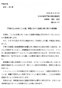 日本共産党門真市議会議員団は6日、宮本一孝市長に対し、「『門真市立大和田こども園』開園に向けた整備工事に関する要望書」を市長宛に提出、こども部長と同次長が対応し、懇談しました。